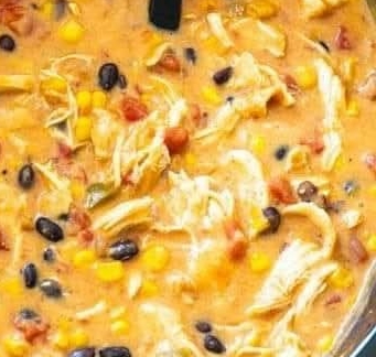 - Add picante sauce, cream of chicken soup, beans, corn, tomatoes, chicken broth, and taco seasoning.