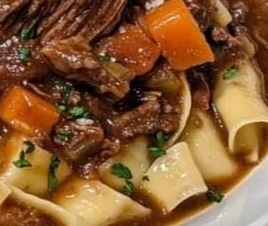 A beautifully hearty sauce with fall-apart tender beef, layered aromatics, and a bold tomato base — clinging perfectly to wide pappardelle noodles for a rustic Italian experience in every bite.