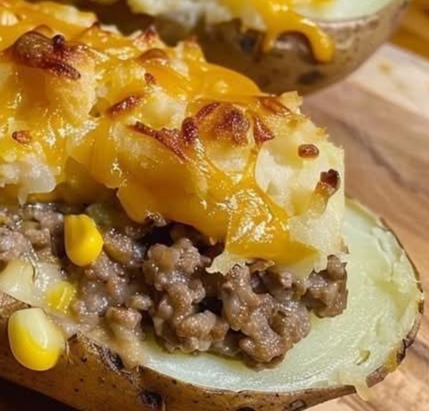 A tender baked potato shell loaded with juicy, savory meat filling and crowned with creamy mashed potato. Every bite delivers comforting warmth and nostalgia — crispy edges, rich gravy, and pillowy potato perfection.