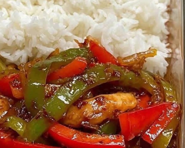 This dish bursts with color and aroma—juicy chicken pieces, bright peppers, and the irresistible fragrance of sizzling garlic. The glossy, savory sauce clings to every bite, while the steamed rice provides a tender, fluffy base that balances the bold flavors. Together, they create a satisfying, well-rounded meal.