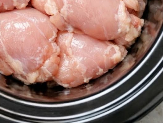 - Place chicken thighs in a single layer at the bottom of your slow cooker.